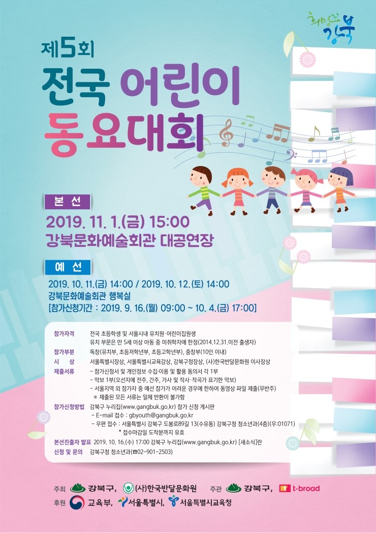 강북구(구청장 박겸수)가 오는 11월 1일(금) 오후 3시부터 강북문화예술회관 대공연장에서 제5회 전국 어린이 동요대회를 개최한다.