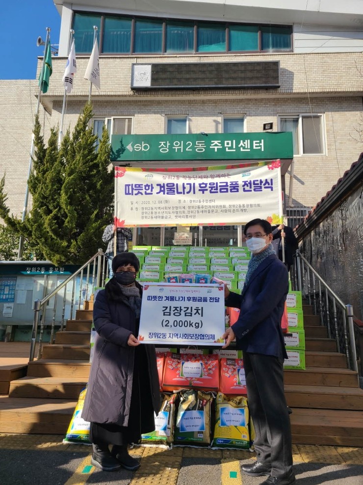 장위2동 주민자치위원회(위원장 길희봉)와 지역사회보장협의체(위원장 김혜자)는 각각 생필품 선물세트 20개와 손수 마련한 복지기금으로 준비한 김장김치 200박스(2,000kg)를 마련했다. 기부된 물품은 관내 저소득 가구와 홀몸 어르신 가정에 전달될 예정이다.