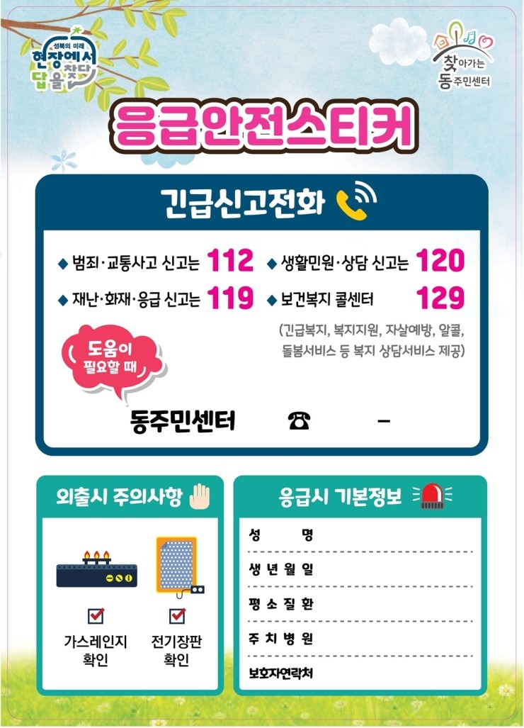 성북구는 지난달 ‘응급안전 안내문’을 제작하고 3월부터 1인 가구·치매·고령 어르신 등 안전 취약계층을 대상으로 집중 배부하고 있다. 복지담당 직원이 가정방문을 통해 직접 전달하고, 동주민센터에 비치해 필요로 하는 구민이라면 누구나 제공하고 있다.