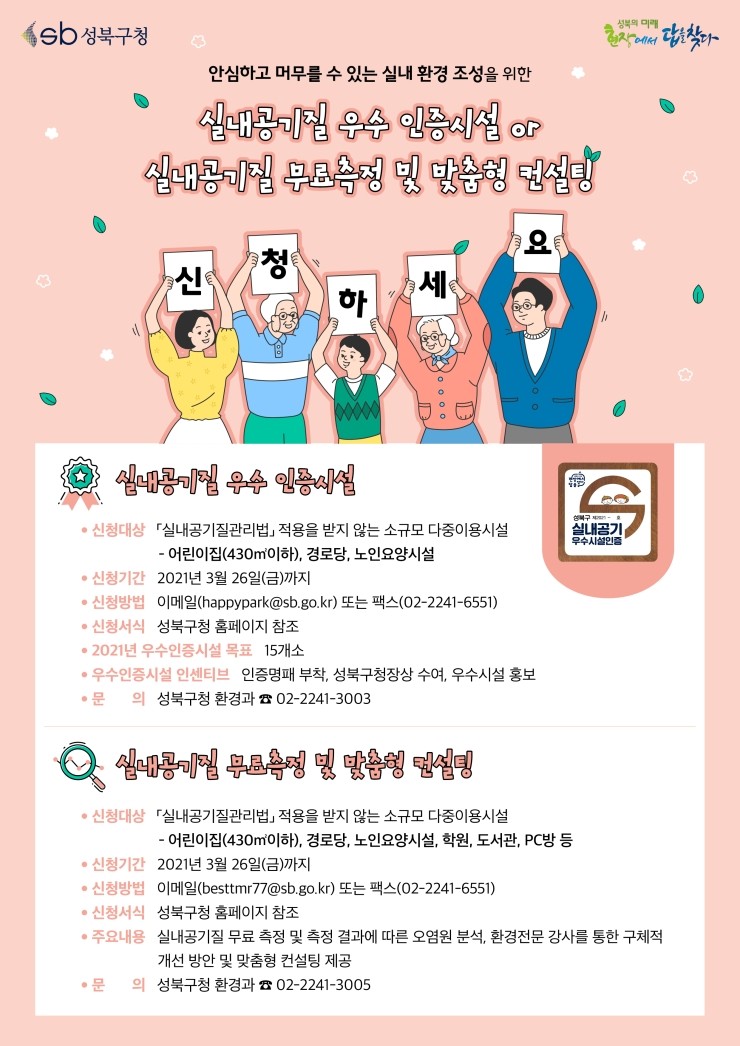 또한 실내 공기질을 잘 관리하고 있는 우수시설에 대해서는 ‘성북구 실내공기질 우수시설’로 인증해 실내공기에 관심을 갖고 쾌적한 실내공기를 유지하고자 노력하는 분위기를 확산하고자 한다. 실내공기질 측정 및 컨설팅 신청기한은 오는 26일까지이며, 신청방법은 성북구 홈페이지>구정소식>구정안내에서 확인할 수 있다.