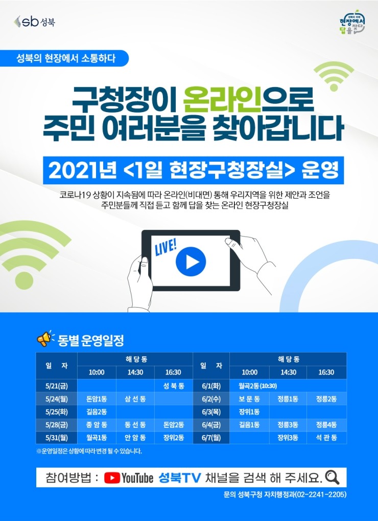 이번 온라인(비대면) 현장구청장실은 21일에 성북동에서 시작, 다음달 7일 석관동을 마지막으로 하여 총 20회에 걸쳐 운영된다. 회의는 줌(zoom) 영상회의를 통해 진행되며, 해당 영상은 유튜브를 통해 실시간으로 송출돼 관심 있는 주민은 누구나 장소 제한 없이 실시간 채팅을 통해 소통에 참여할 수 있다.