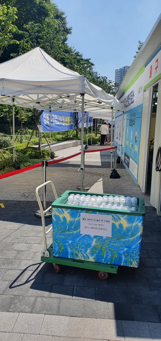 연일 기록적인 폭염에 구는 현재 성북구청 바람마당과 길음역 어울림마당에 운영 중인 임시선별진료소 2개소에 얼린생수와 우산을 비치했다. 검사를 받으러 온 시민에게 얼린생수를 배부해 대기하는 동안 열을 식힐 수 있도록 하고 있다.