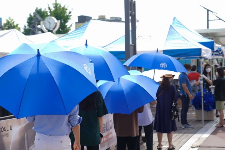임시선별진료소에 줄 지어 선 파란우산 대열도 눈에 띈다. 구가 폭염대피용으로 비치한 우산인데 선별진료소를 찾은 시민들에게 인기를 끌고 있다. 시각적으로나마 청량감을 전달하도록 우산의 색도 파란색으로 맞췄다. 우산 크기도 커 펼치면 뜨거운 볕이 충분히 가려지고, 우산을 든 대기자 간에 자연스럽게 거리두기도 지켜진다.