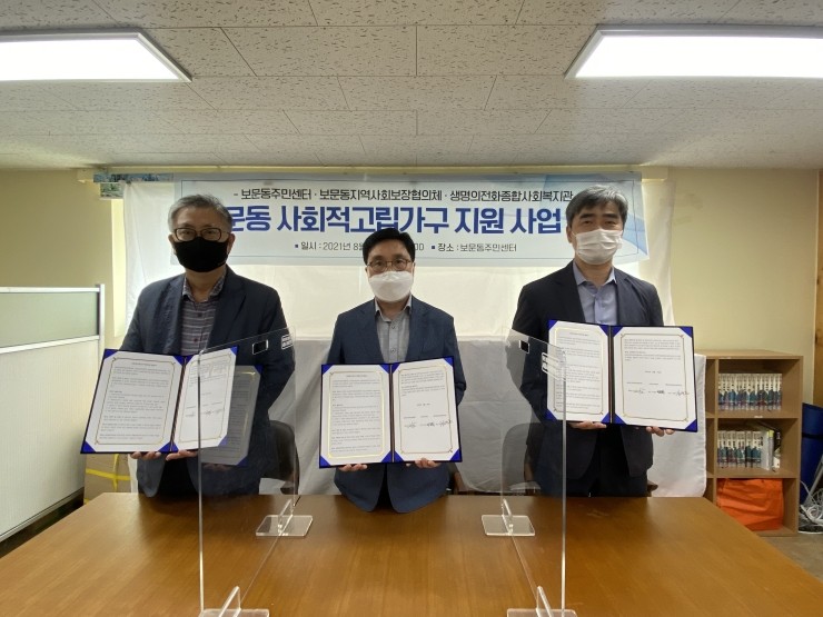 성북구(구청장 이승로)가 지난 18일 ‘2021 보문동 사회적고립가구 지원사업’ 추진을 위해 보문동 지역사회보장협의체, 생명의전화종합사회복지관과 업무협약을 체결하였다.