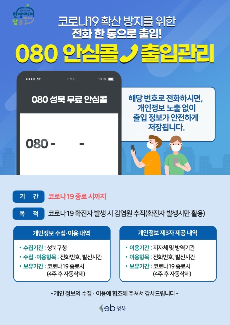 080 성북 무료 안심콜은 방문객이 해당 업소 고유번호로 전화하면 자동으로 전화번호와 출입시간이 기록되는 방식으로 구는 수기명부 작성에 따른 개인정보 유출과 허위기재로 인한 역학조사의 어려움 해소에도 도움이 될 것으로 기대하고 있다.
