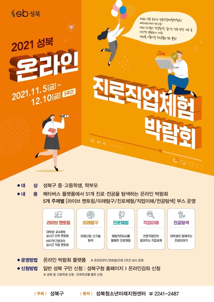 성북구(구청장 이승로)가 11월 5일부터 12월 10일까지 총 5주간 ‘2021 성북 온라인 진로직업체험박람회’를 개최한다.