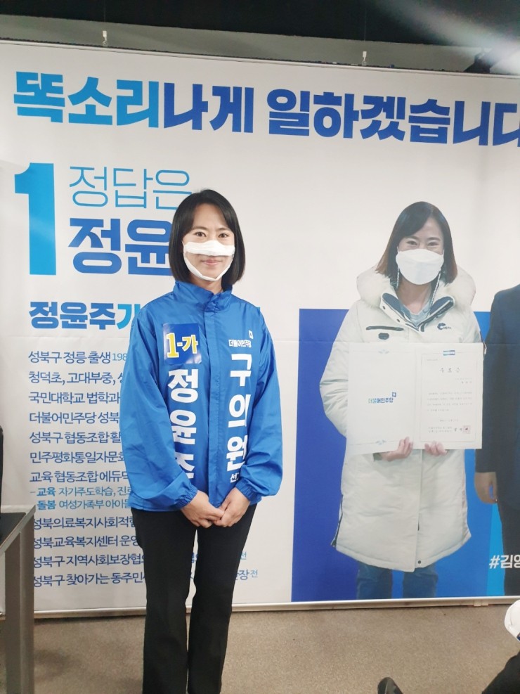 정 후보는 41세 여성으로 정덕초, 성신여고, 국민대 법학과를 졸업한 성북 토박이다. 성북에서 태어나 성북에 살면서 사회적 경제 분야에서 발군의 실력을 선보인 인물로 정평이 나있다. 사회적 경제 분야에서 교육협동조합 에듀닥터바른배움 이사장을 역임하면서 교육 발전에 이바지하기도 했다.