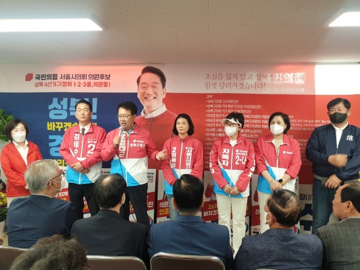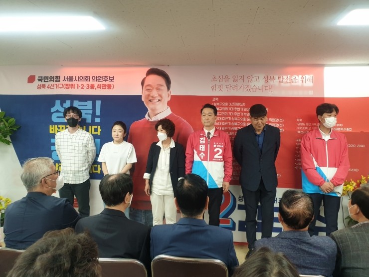 김태수 후보는 “이렇게 많이 성원해 주셔서 진심으로 감사드린다. 잃어버린 12년을 반드시 되찾아 오겠다. 우리 장위,석관 지역은 많이 낙후됐다. 성북구의원 3선을 지내는 동안 구석구석 다 다니면서 열심히 민원을 챙겼다. 그 공로로 후보에 오른 것 같다. 초심으로 돌아가 더욱 열심히 노력하겠다. 정태근 성북구청장 후보와 저 김태수 여기 계신 국민의힘 출마자들이 모두 당선되도록 지지 부탁드리며 심부름꾼으로 써 주시길 간곡하게 부탁드린다”고 출마의 변을 대신했다.