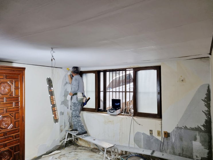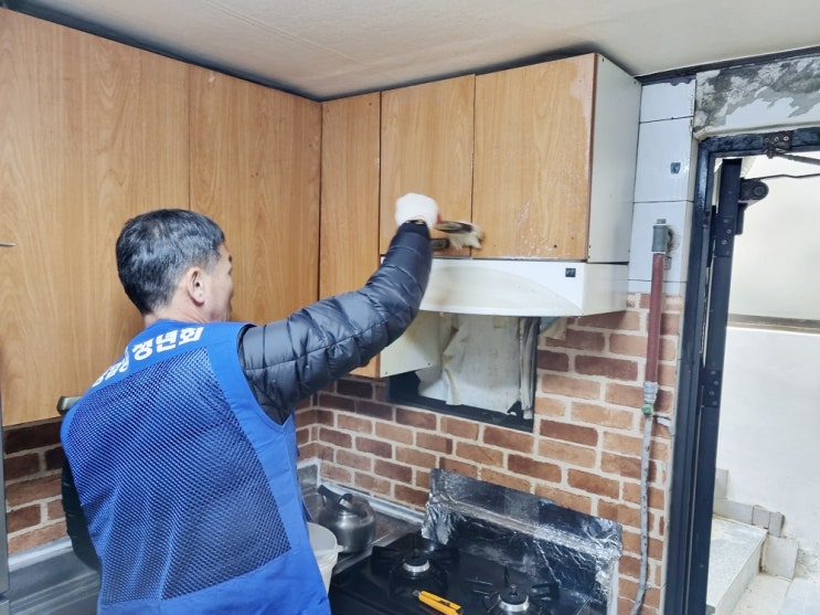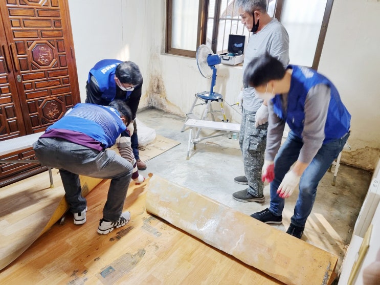 청년회는 도착하자마자 어르신을 편안한 곳으로 모시고, 물건을 밖으로 꺼내 놓고 바로 집수리를 진행했다. 기존 벽지와 장판을 뜯어내고 약품을 이용하여 곰팡이 제거 후 새로운 벽지와 장판을 깔고 노후 된 형광등과 콘센트도 교체하였으며 어르신의 안전을 위하여 소화기 비치, 연기감지기 및 가스차단기를 설치하였다.