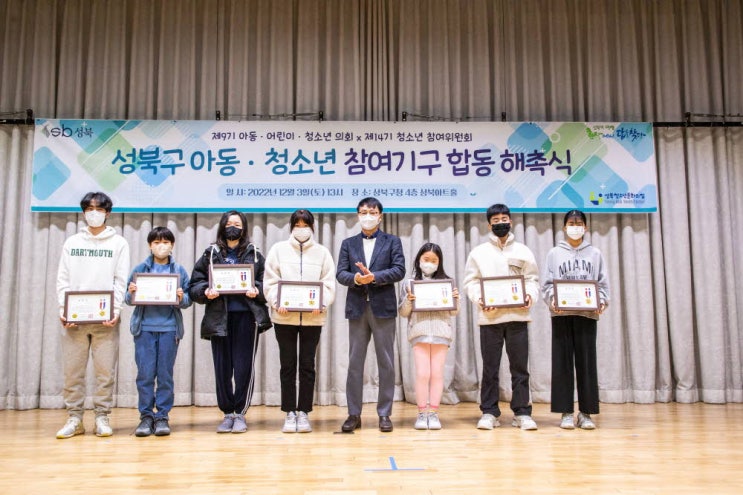 성북구(구청장 이승로)가 지난 3일 ‘성북구 어린이·청소년 참여기구 합동 해촉식’을 성북구청 아트홀에서 개최했다. 이날 제9기 어린이·청소년의회와 제14기 아동·청소년 참여위원회 위원을 비롯하여 대학생 보좌관 및 학부모 등 100여 명이 참석해 자리를 빛냈다.