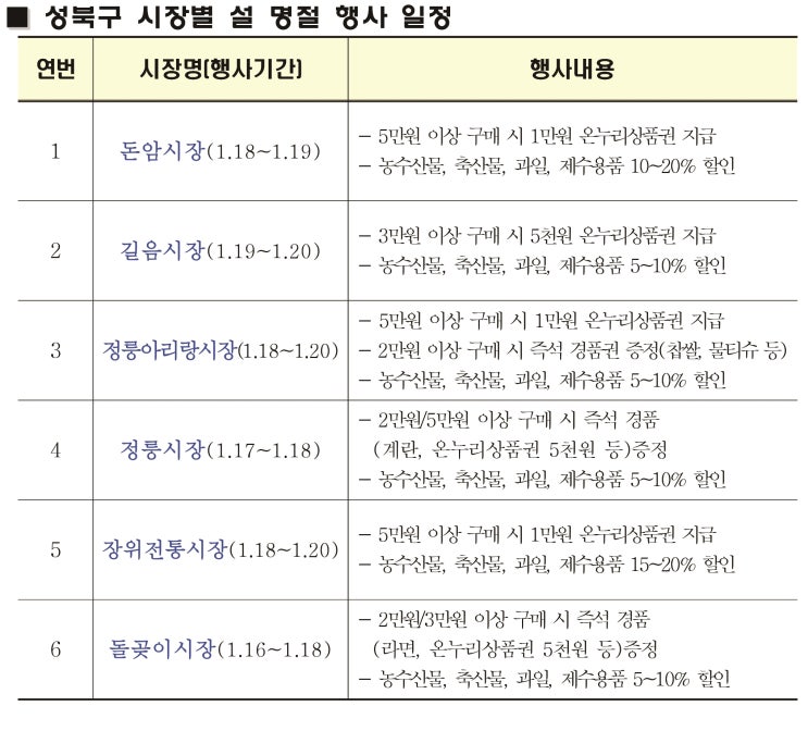 시장별로 행사 기간 및 구체적인 혜택 내용은 상이하므로 자세한 내용은 해당 시장 또는 성북구청 지역경제과에 문의하면 된다.