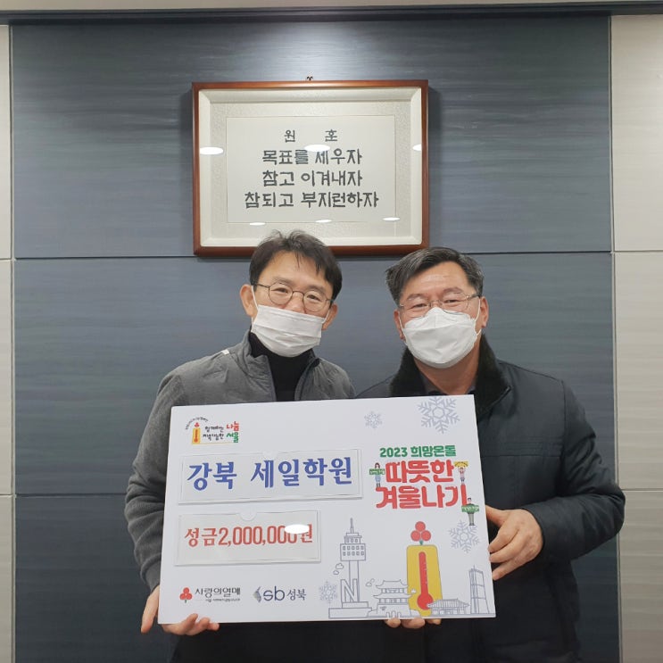 지난 10일 강북세일학원에서 관내 취약가구의 따뜻한 겨울나기를 위한 성금 2백만원을 전달하였다. 교육기업 강북세일학원은 매년 꾸준히 기부에 참여하여 지역사회의 귀감이 되고 있다.