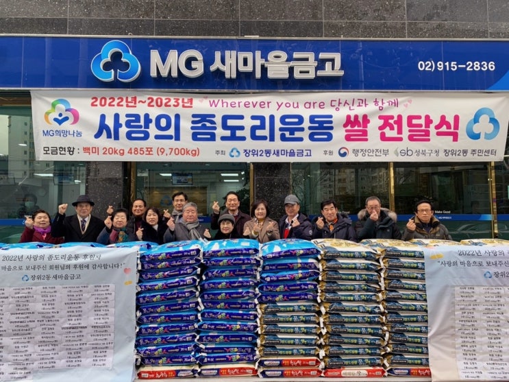 지난 17일 장위2동새마을금고(이사장 한종열)에서 임직원을 비롯하여 지역주민들의 적극적인 참여로 백미 20kg짜리 485포를 모아 장위2동주민센터(동장 김용환)에 기탁하였다. 이는 시가 총 2천5백만원 상당이며 지역 내 형편이 어려운 이웃에게 전달되었다. ‘사랑의 좀도리 쌀 전달식’은 장위2동새마을금고에서 수년째 계속되고 있는 행사로서 지역사회 이웃사랑 실천에 크게 이바지하고 있다.