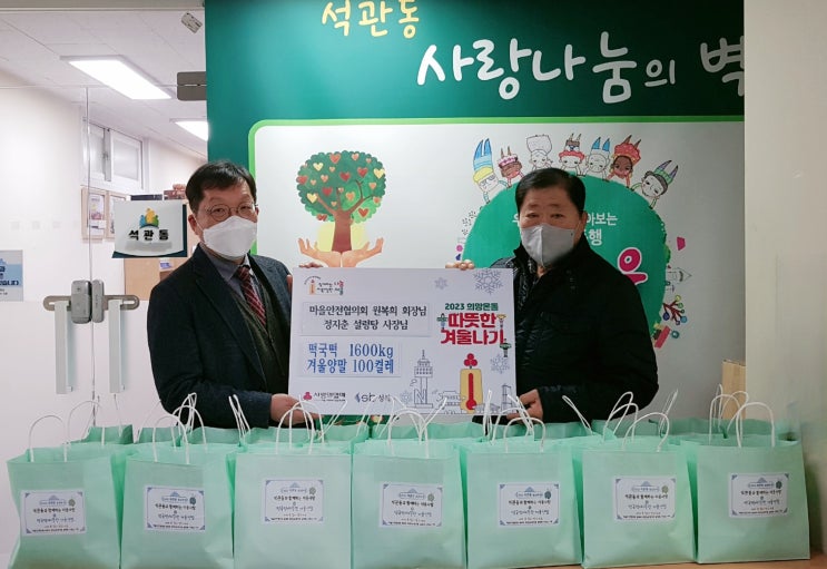 석관동에서 지난 16일 마을안전협의회(회장 원복희)와 정지춘설렁탕에서 어려운 이웃이 따뜻한 설날을 보낼 수 있도록 떡국떡 1,600kg과 겨울 양말 100켤레를 기부했다. 이어 석계역음식문화거리 상점 사장님들이 기부에 동참하여 수양숯불갈비 20만원 등 총 10개의 상점이 107만원 상당의 성금·성품을 기부했다. 이 외에도 탑마트에서 백미 10kg짜리 100포, 비전고시원에서 20만원 성금을 기부했다.
