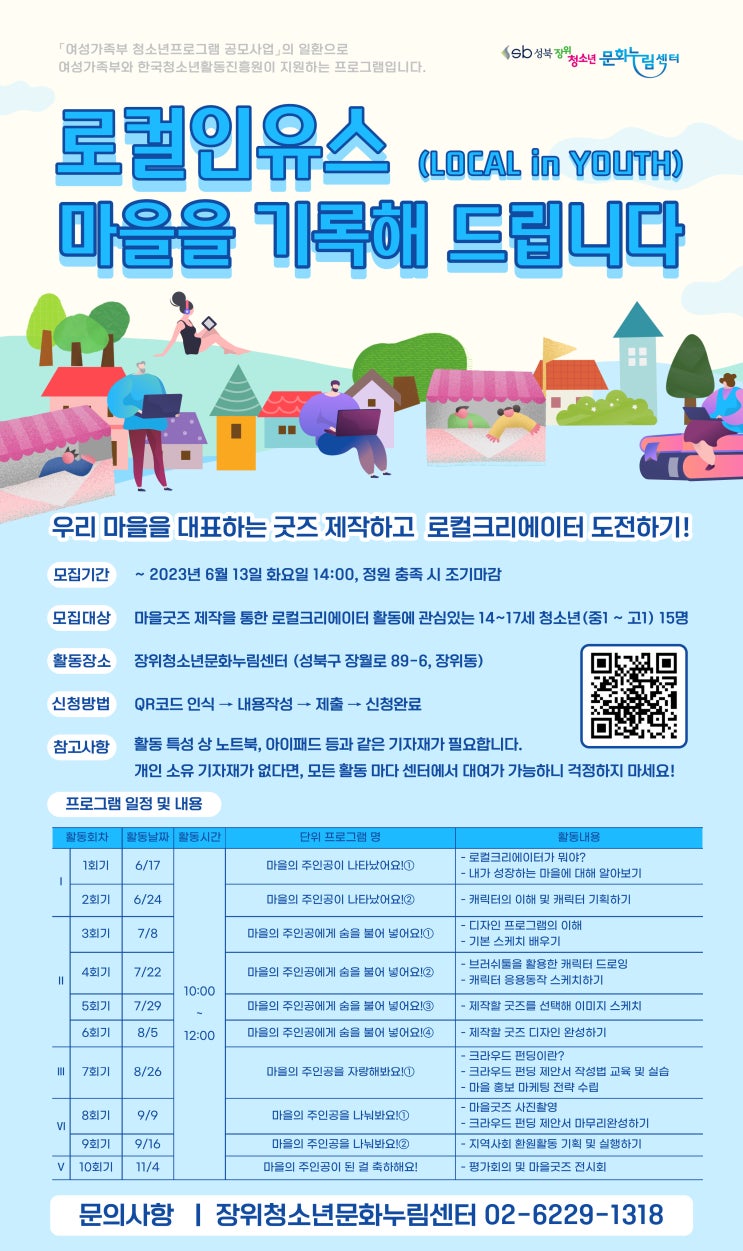 성북구(구청장 이승로)가 장위청소년문화누림센터에서 2023 여성가족부 청소년프로그램 공모사업으로 「로컬인유스 마을을 기록해 드립니다」를 운영한다.
