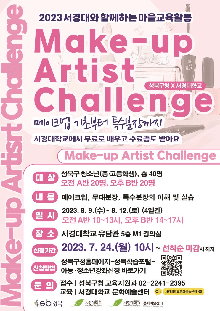 이번 서경대 메이크업 아티스트 챌린지 프로그램은 무료로 진행하며, 전체과정 수료 시 수료증을 제공할 예정이다. 기타 자세한 내용은 성북구청 홈페이지를 참고하거나 성북구청 교육지원과(☎02-2241-2395)로 문의하면 된다.