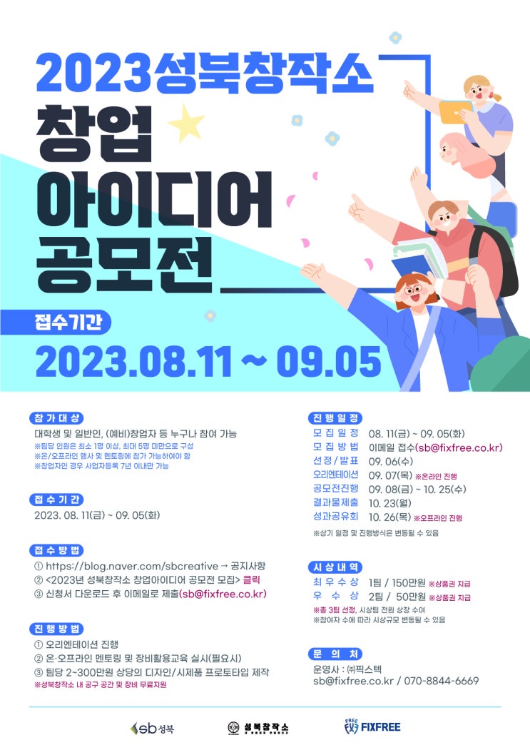 이번 창업 아이디어 공모전은 대학생 및 일반인, (예비)창업자 등 지역과 관계없이 창작활동에 관심 있는 사람이라면 누구나 지원할 수 있으며, 창업자의 경우 사업자등록 후 7년 이내인 사람만 참가할 수 있다. 신청은 성북창작소 블로그(https://blog.naver.com/sbcreative/223181164386)를 통하여 진행된다.