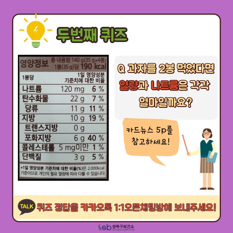 성북구민 누구나 비대면으로 참여할 수 있으며 가공식품을 구매할 때 확인해야 하는 영양표시 정보(영양표시, 왜 영양표시 확인해야 할까요?, 어떻게 영양표시 확인하면 될까요? 카드뉴스 4종)를 제공하며 참여자는 퀴즈 2개와 미션에 도전할 수 있다.