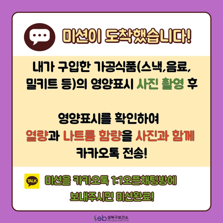 성북구(구청장 이승로)가 “바른 식생활 실천 캠페인”의 일환으로 실생활에서 가공식품 구매 시 영양표시를 확인하는 습관을 만들기 위해 『성북의 영양표시 똑똑하게 확인하기』 이벤트를 진행한다.