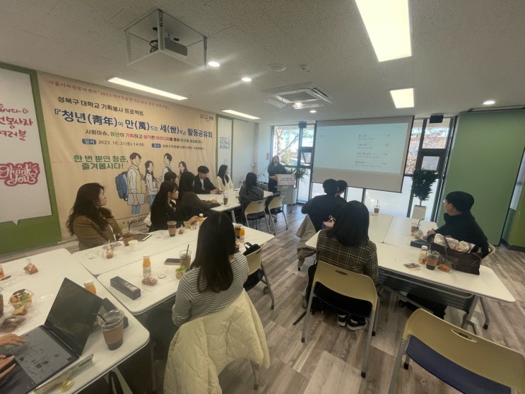 성북구(구청장 이승로)가 21일 성북구자원봉사센터에서 관내 대학교 봉사단 20여 명이 참여한 가운데 성북구 대학교 기획봉사 프로젝트 ‘청년이 만드는 성북’ 활동공유회를 개최했다.