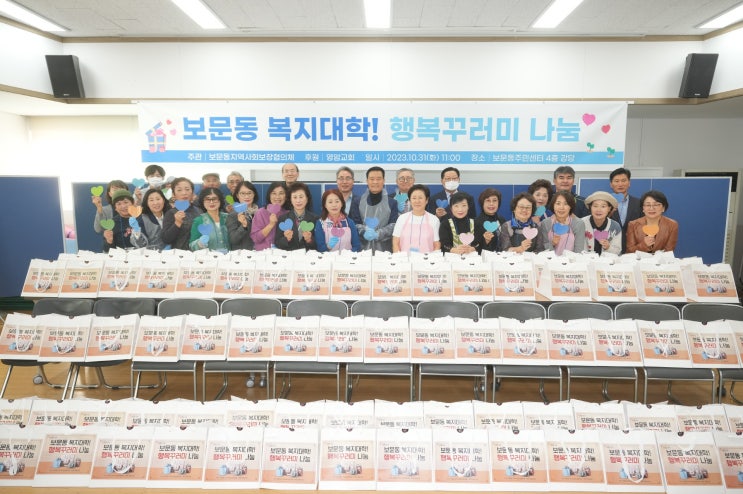 보문동에서는 지난달 31일 동 복지대학 공동체 활동으로 행복꾸러미 지원 행사를 열었다. 꾸러미 내용물은 갈비탕, 김치, 떡, 마스크, 한방파스 등 5가지로 구성했다. 안암교회가 갈비탕 100인분을 후원했으며, 나머지 물품은 보문복지사랑채 기금으로 준비했다.