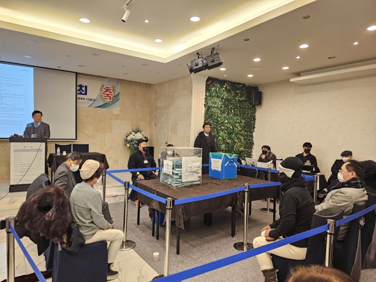 이날 조합원 총회의 백미는 조합장 선거다. 현 박용수 조합장의 늦은 사업추진을 심판하자며 3명의 조합장 후보가 나섰다. 하지만 기호2번 박용수 현조합장 444표, 기호1번 김우환 121표, 기호3번 이현숙 352표, 기호4번 이준우 98표를 얻어 현 박용수 조합장이 재신임을 받았다.