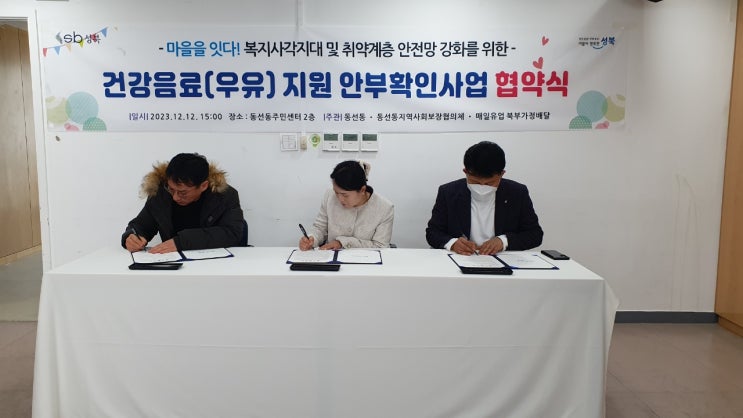 성북구(구청장 이승로) 동선동주민센터(동장 이명복)가 지난 12일 동선동지역사회보장협의체(위원장 박운학), 매일유업 북부가정지점(대표 박영삼)과 함께 ‘사회적고립가구 건강음료지원’ 협약을 맺었다.
