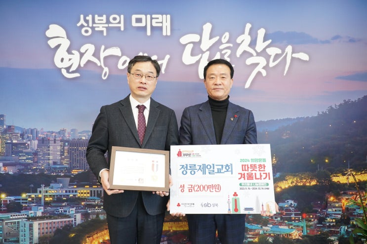 이승로 성북구청장은 정릉제일교회에 감사장을 전달하며 “매년 어려운 이웃을 위해 함께해 준 정릉제일교회의 관계자분들께 감사드린다”라며 “촘촘한 복지사업을 펼쳐나가 사각지대가 발생하지 않도록 노력할 것이며, 성금이 정릉1동 어려운 이웃에게 돌아갈 수 있도록 최선을 다하겠다. 앞으로 지역사회를 위해 교회와 구청, 동주민센터가 함께 협력할 수 있으면 좋겠다”라고 말했다.