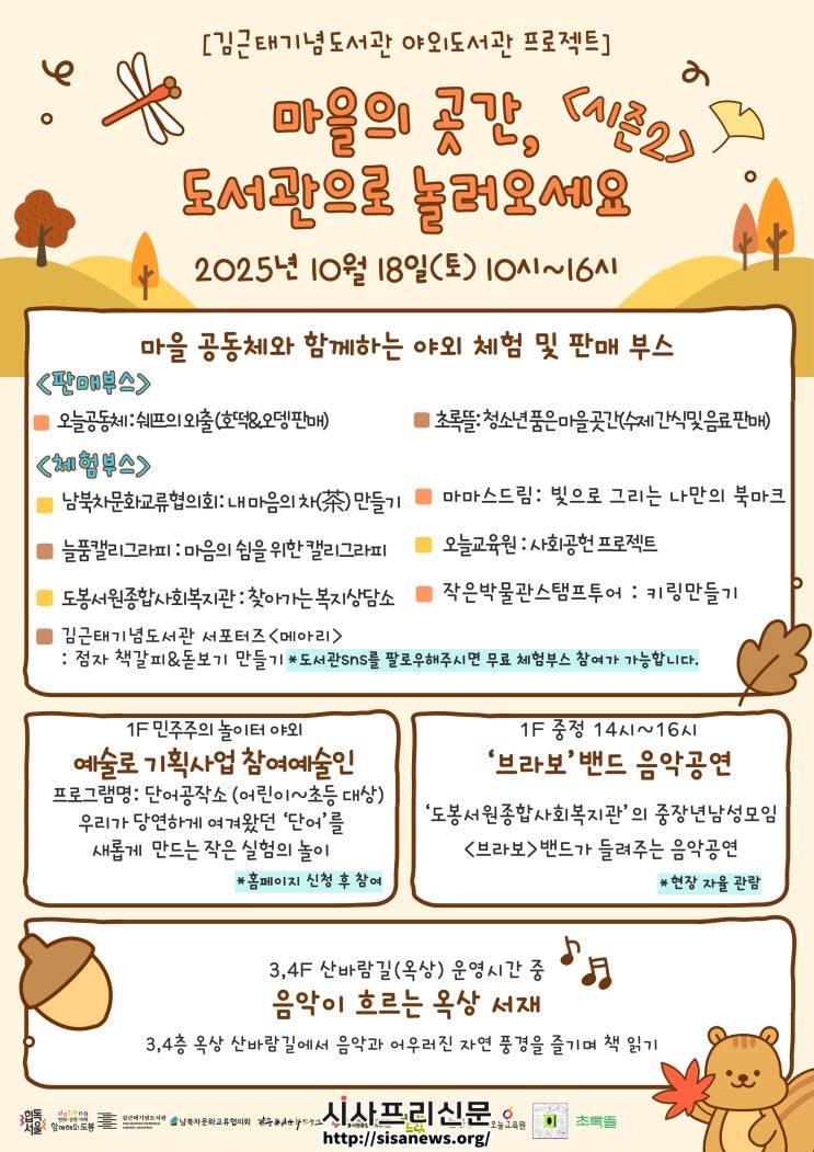 도봉구 김근태기념도서관(관장 이종창)은 가을을 맞아 오는 10월 18일(토)부터 19일(일)까지 주말 이틀간 도서관 전역을 개방하여 지역과 함께하는<2025 야외도서관 프로젝트>를 진행한다고 밝혔다.