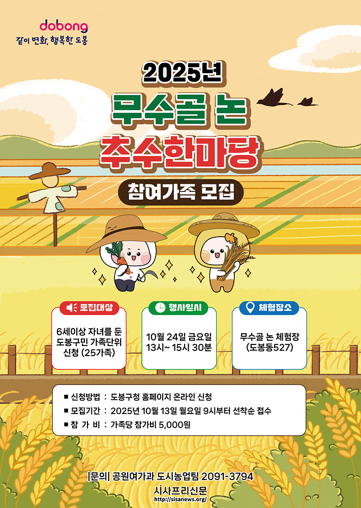 도봉구(구청장 오언석)가 오는 10월 24일 무수골 친환경 논 체험장(도봉동 527)에서 ‘무수골 논 추수한마당’ 행사를 개최한다.