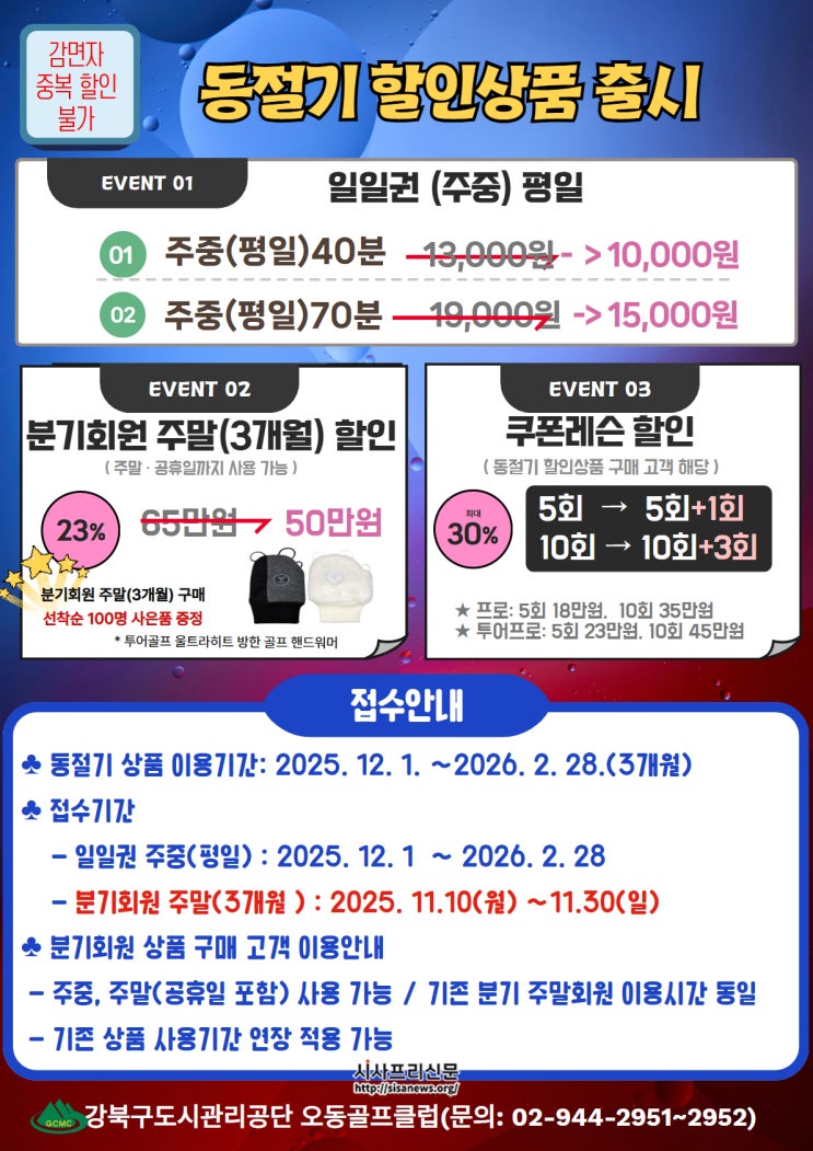 이어 11월 10일부터 11월 30일까지는 동절기 한정 할인상품이 판매된다. 할인 대상은 주중 일일권과 주말 분기권이다. 할인상품 이벤트는 2025년 12월 1일부터 2026년 2월 28일까지 3개월간 운영되며, 최대 23%의 할인 혜택이 제공된다.