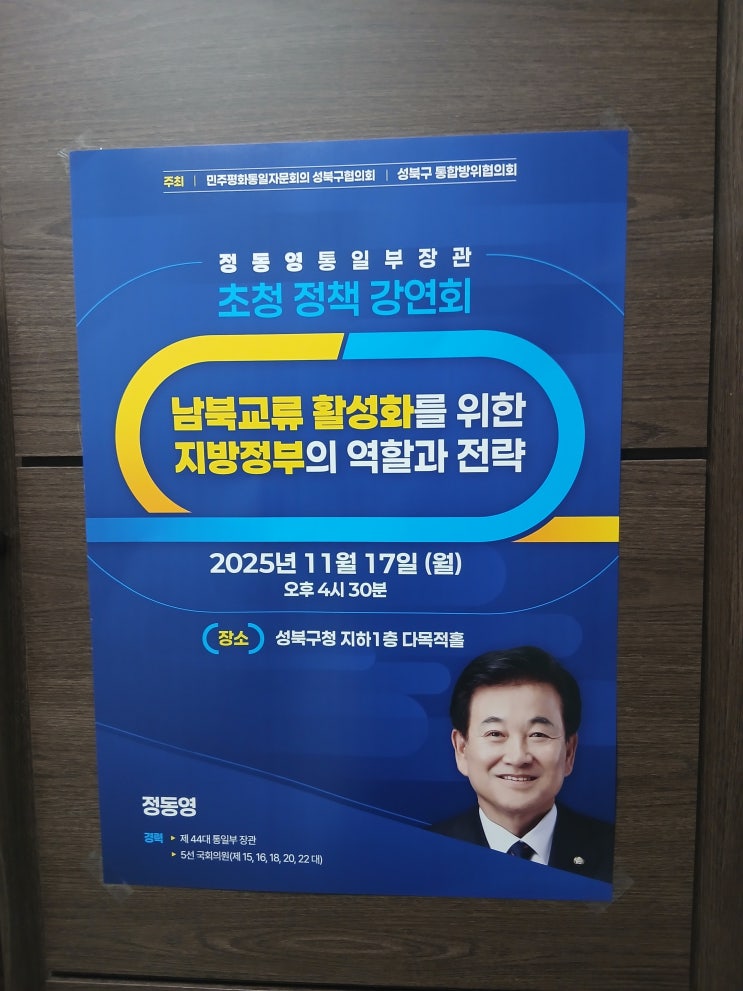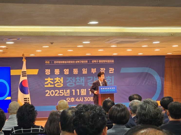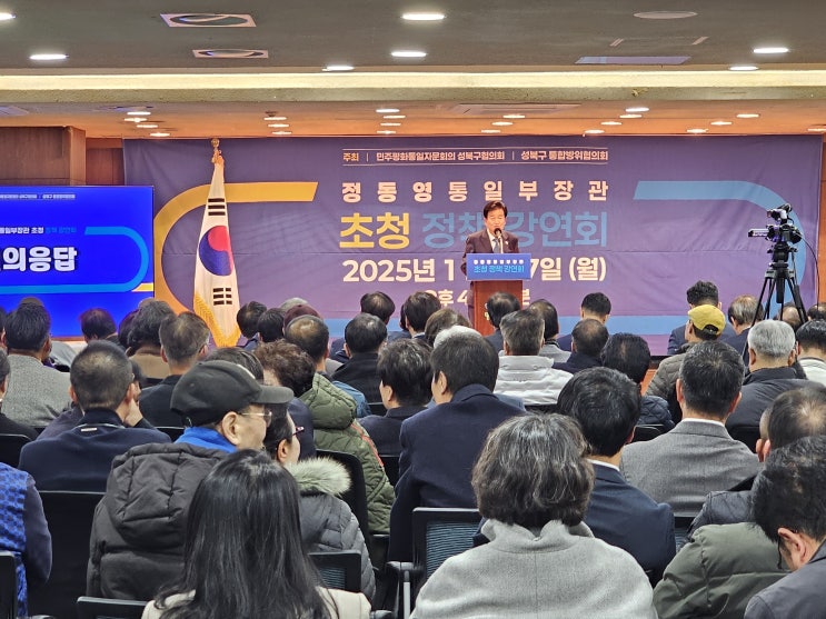 (시사프리신문=정진만 기자) 민주평화통일자문회의 성북구협의회와 성북구 통합방위협의회는 지난 11월 17일 오후 성북구청 지하 1층 다목적홀에서 정동영 통일부 장관 초청 정책 강연회를 열었다.