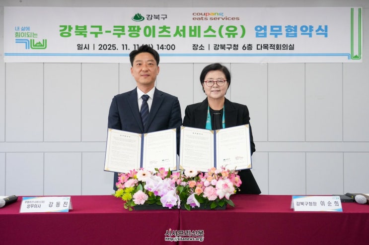 같은 날 오후 2시에는 구청 다목적회의실에서 강북구와 쿠팡이츠서비스 간 업무협약식이 열렸다. 협약식에는 이순희 강북구청장과 강동진 쿠팡이츠서비스 상무이사를 비롯한 관계자들이 참석해 민관 상생 협력 의지를 다졌다.