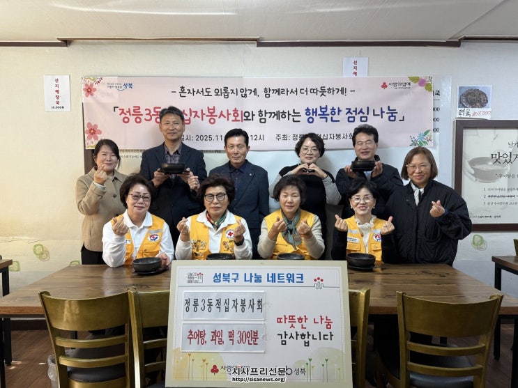 정릉3동 적십자봉사회(회장 정필남)는 지난 11월 10일, 지역 내 저소득 독거어르신 30명을 초청해 점심 식사를 대접했다. 이날 어르신들에게는 추어탕과 과일, 떡 등 정성스러운 후식이 제공됐으며, 봉사회 회원들은 직접 서빙과 말벗 활동에 참여했다.