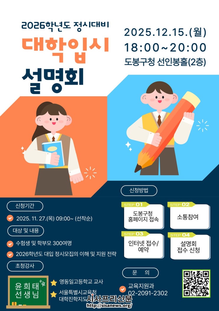 도봉구(구청장 오언석)가 12월 15일 오후 6시 도봉구청 2층 선인봉홀에서 2026학년도 대입 정시 전략 설명회를 개최한다.