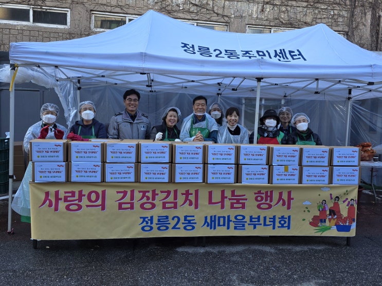 정릉2동 새마을부녀회(회장 이덕남)는 11월 21일 회원들이 직접 김장김치를 담가 독거 어르신 및 저소득 30가구에 전달했다.