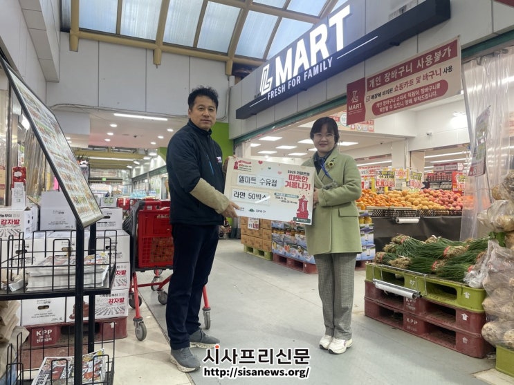 지난 5일 엘마트 수유점(본부장 우성)은 수유3동 주민센터에 130만원 상당의 라면 50박스를 전달했다. 수유중앙시장 내 위치한 엘마트 수유점은 다양한 식재료와 생활용품을 판매하며 대형 마트로, 많은 주민들이 애용하고 있다.