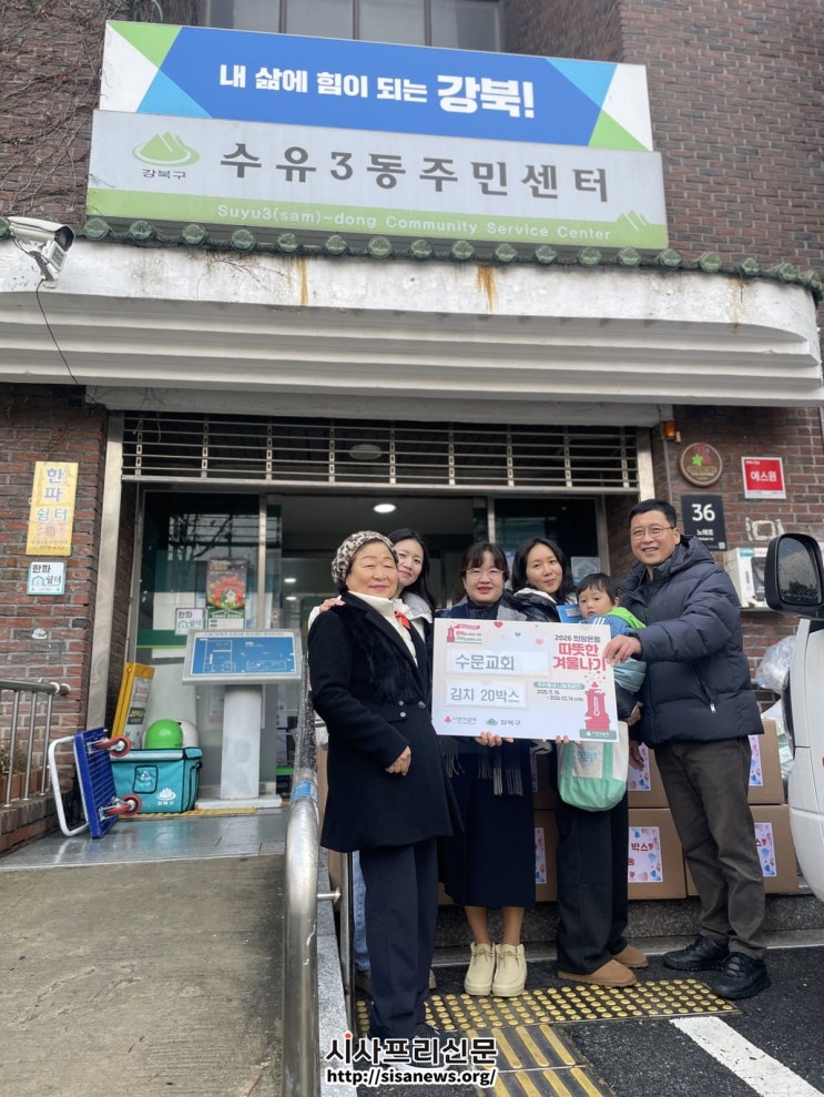 11일에는 수문교회(담임목사 김선몽)가 수유3동 주민센터에 독거어르신을 위한 식료품과 김치 20상자를 기부하며 캠페인에 동참했다.