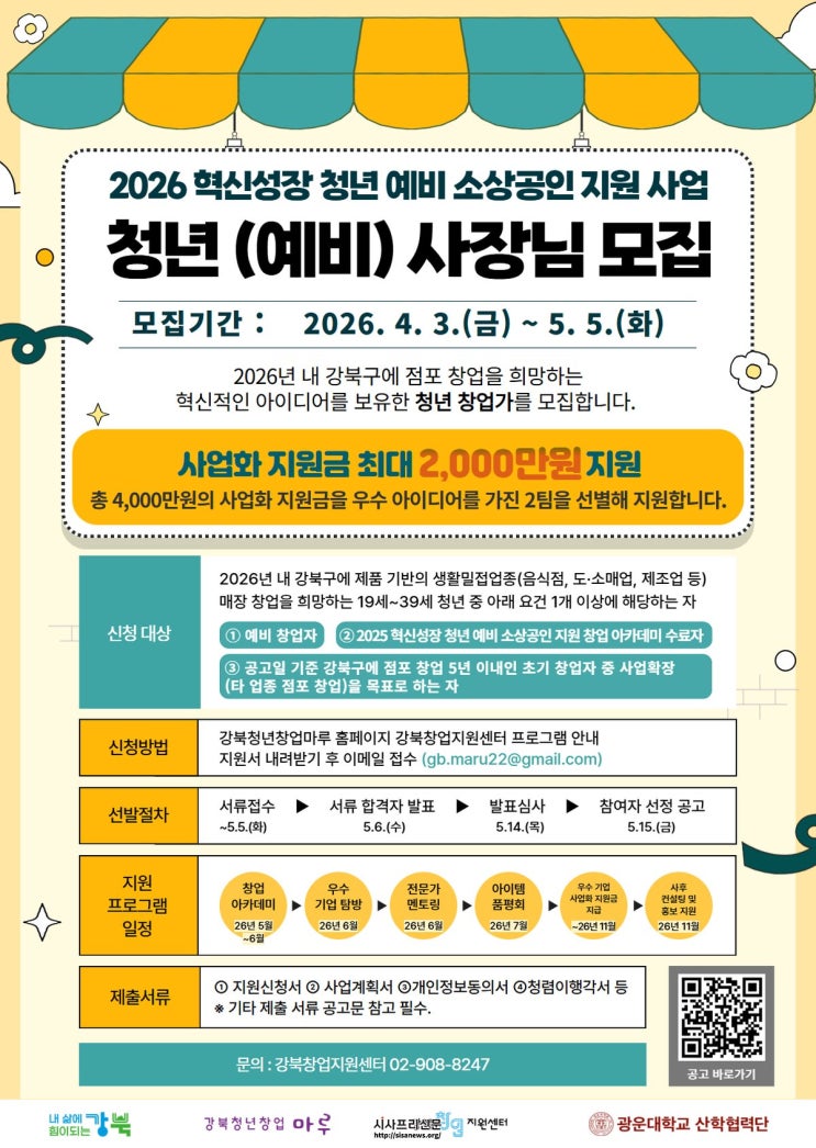 모집 대상은 2026년 내 강북구에 점포 창업을 희망하는 19세 이상 39세 이하 청년으로, 예비창업자 및 5년 이내의 초기 창업자를 포함한다. 이 중 초기 창업자는 분점이 아닌 독립 점포 형태로 생활밀접업종 분야의 신규 창업을 계획하고, 1인 이상 고용 창출이 가능한 경우 신청할 수 있다.