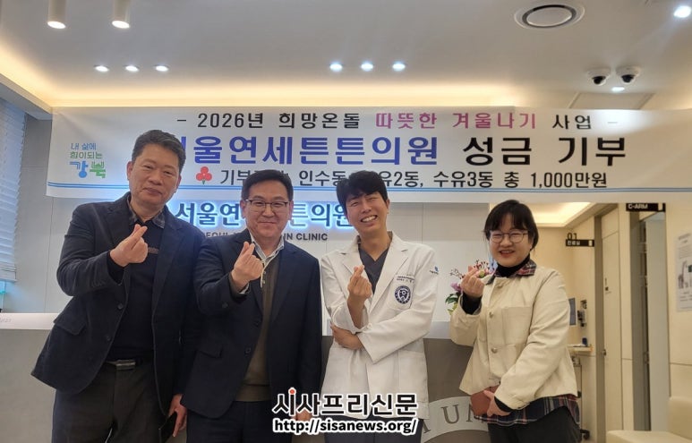 강북구 수유2·3동·인수동, 서울연세튼튼병원으로부터 성금 기부받아 ▲강북구 수유2·3동·인수동, 서울연세튼튼병원으로부터 성금 기부 강북구(구청장 이순희)는 인수동 소재 서울연세튼튼병원(원장 고병웅)이 지난 11월 20일 지역사회의 어려운 이웃을 돕기 위해 2026...