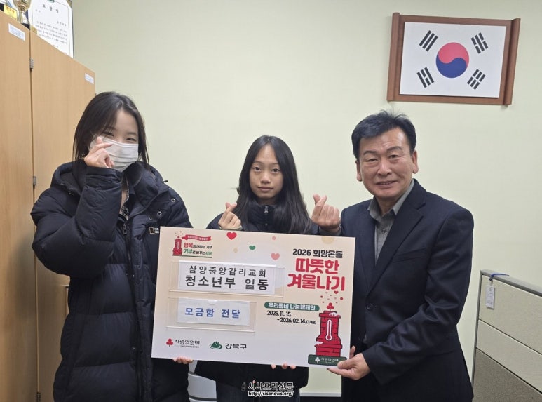 강북구 삼각산동, ‘2026 희망온돌 따뜻한 겨울나기’ 성금·물품 기탁 관내 주민과 교회, 요식업체 참여로 소외계층 지원에 온정 전달 익명 기부부터 청소년 모금까지 다양한 참여로 훈훈한 연말 나눔 확산 ▲이종철 삼각산동장(오른쪽)과 삼양중앙감리교회 청소년...