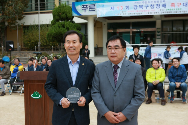 서울시의회 보건복지위원회 이복근 의원이 지난 23일 강북중학교 운동장에서 열린 ‘제13회 강북구청장배 족구대회’에서생활체육인 족구 발전에 선도적인 역할과 기여한 공으로 족구연합회 회원들의 마음을 담은 감사패를 조휘석 강북구족구연합회장으로부터 받았다....