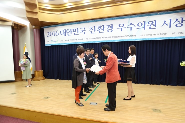 도봉구의회 의장 조숙자 의원(쌍문2·4동, 방학3동)은 지난 달 27일 국회의원회관 대강당에서 열린 2016 대한민국 친환경 우수의원상 시상식에서 ‘대한민국 친환경 우수의원’으로 선정됐다. 이번 수상에 있어 조숙자 의원은 도봉산과 둘레길 주변의 환...