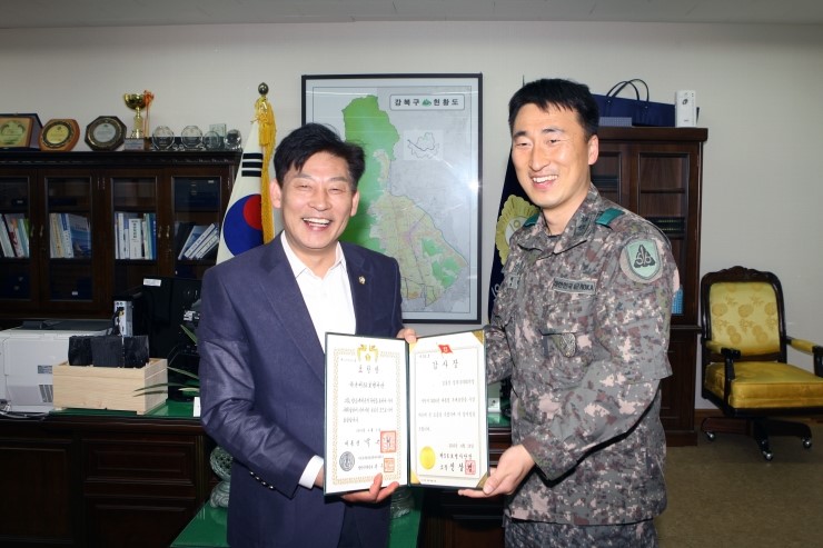 강북구의회 김동식 의장은 지난 달 29일 의장실에서 활발한 의정활동 및 통합방위태세 확립에 기여한 공로를 인정받아 56사단으로부터 감사장과 감사패를 수여 받았다. 56사단(제56향토보병사단)은 수도방위사령부 예하 부대로 한강 이북 지역의 향토 방위를 책임지고 있...
