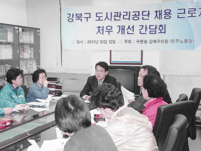 강북구의회(의장 유군성) 구본승 의원(미아동·송중동·번3동)은 민주노동당 강북구위원회, 서울일반노동조합과 함께 지난 12일과 20일 ‘강북구도시관리공단 비정규직근로자 처우개선 및 고용안정 간담회’를 총 5회를 진행하고 현장의 목소리를 듣는 의...