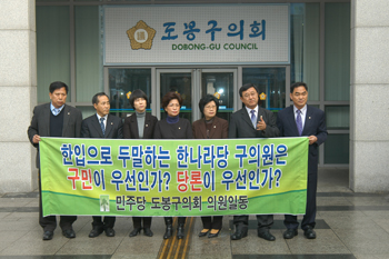 도봉구의회(의장 이석기)는 지난 17일 제203회 4차 정례회를 개최하기로 했지만, 구의회 여·야 의원들의 입장이 서로 달라 2011년도 예산안이 통과되지 못하고 당일 24:00부로 자동 산회되는 역사상 유례없는 사태가 벌어졌다. 이날 오전 10시 도봉구의원들은 ...