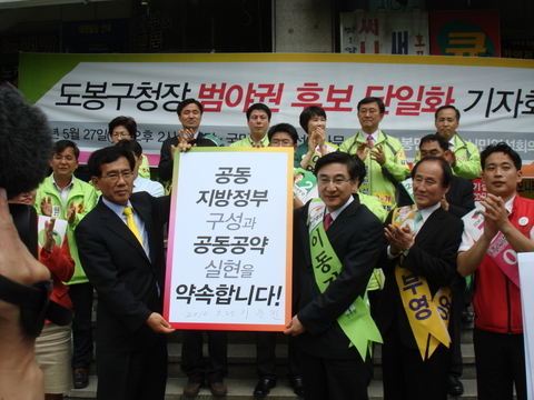 도봉구청장 범야권 단일후보 발표 기자회견이 5월 27일(목) 오후 2시에 민주당 이동진 후보, 국민참여당 이백만 후보 선거사무소 앞에서 열렸다. 이날 기자회견은 민주주의를 부정하고 왜곡하는 한나라당 지방자치의 현실은 더 이상 좌시할 수 없는 상황에 이르렀다며 ...