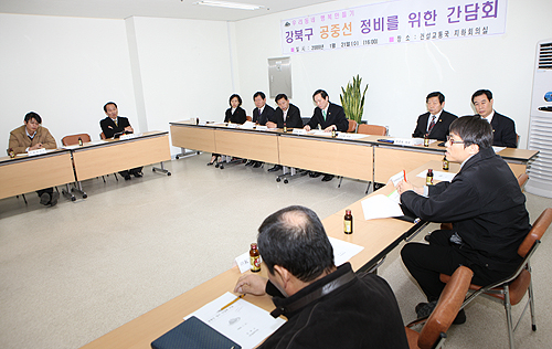 강북구의회(의장 안광석) 건설위원회(위원장 정상채) 소속 의원들이 지난 21일 수요일 구청별관 지하 1층 회의실에서 전기 및 통신업체 관계자와 구청의 관계국장 등이 참석한 가운데 무질서하게 난립돼 도시미관을 해치고 있는 공중선 정비에 대한 간담회를 가졌...