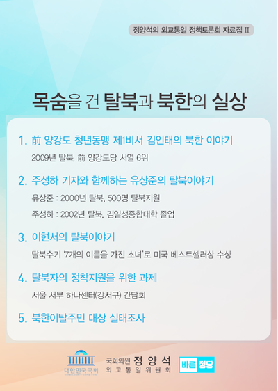 국회 외교통일위원회 정양석 국회의원(바른정당 강북갑)은 탈북자들이 들려주는 북한이야기를 담아 두 번째 정책자료집 ‘목숨을 건 탈북과 북한의 실상’을 발간했다. 정양석 국회의원은 북한의 실상을 파악하고 탈북자 지원의 개선 방향을 논의하고자 지난 2월부터 4회에...