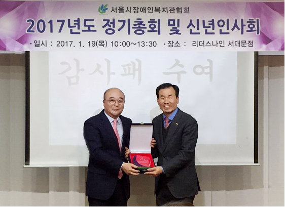 이복근 서울시의원은 지난 19일 서대문구 리더스나인에서 열린 ‘서울시 장애인복지관협회 2017년 신년인사회’ 자리에서 장애인복지관 지원에 대한 공로로 서울특별시 장애인복지관협회(조석영 회장)로부터 감사패를 받았다. 이의원은 지난 2014년과 2016년 서...